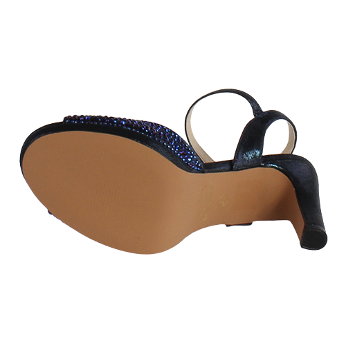 Elegant and glitzy, wider fit, gem embellished peep toe front sandal, with narrow ankle strap and buckle detail.