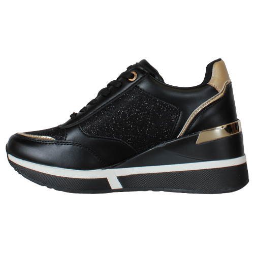 Eye catching laced wedge  trainers with side zip detail, contrast and glitter side panels and contrast heel trim.