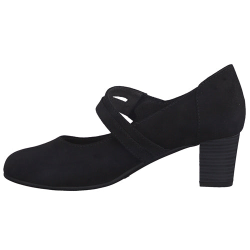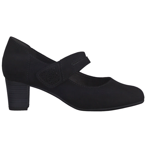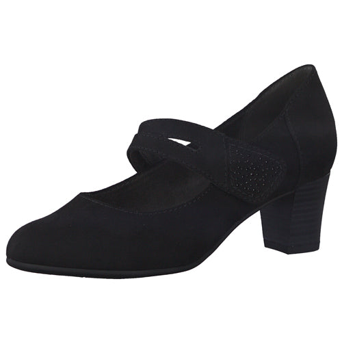 Chic, Mary Jane style, slip on pumps with double diagonal velcro cross strap, with mini stud embellishment to side.