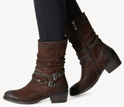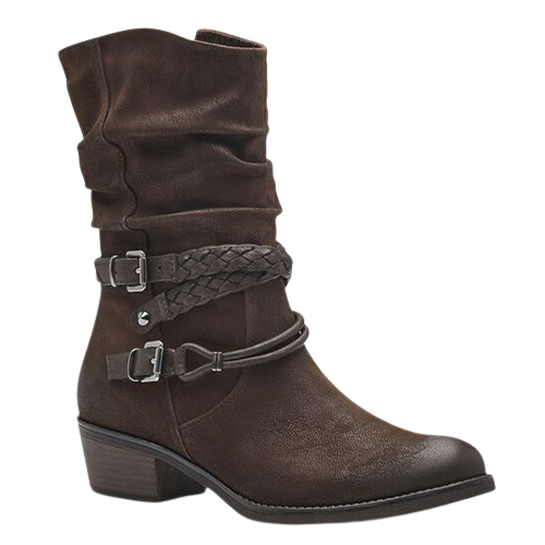 Slouchy, vegan, faux nubuck ruched style mid boot, with almond toe and wraparound smooth/plaited strap with metallic buckles.