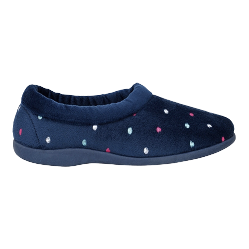 Soft velour slippers embellished with multi coloured polka dots and contrast topline trim.