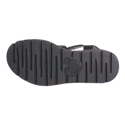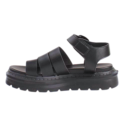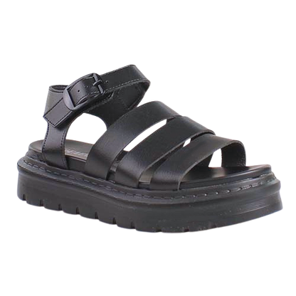 Trendy, docs inspired, vegan friendly sandals with triple front straps, adjustable ankle strap with buckle and cleated sole.