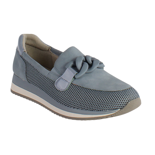 Sporty and timeless, wider fit slip on loafers with mesh side panels, beige trims, floral heel trim and metallic front chain embellishment.