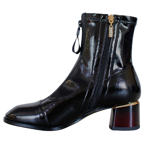 Glamorous, high shine patent effect, sock style ankle boots with decorative faux zip detail to front and metallic trim at heel.