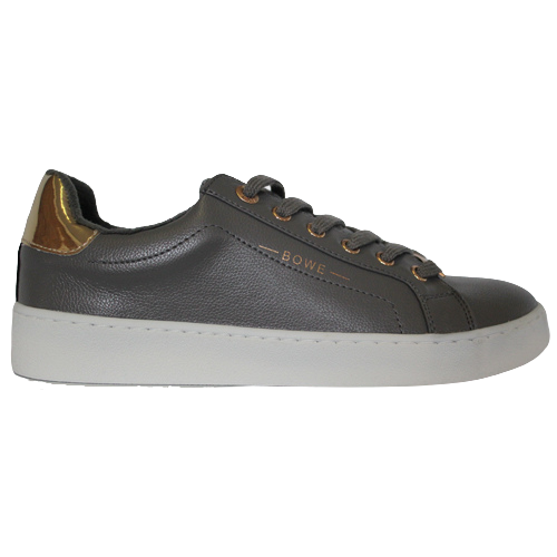 Simply styled trainers with six metallic eyelets , metallic heel trim, contrast sole , with Bowe branding to side, front and tongue.