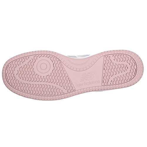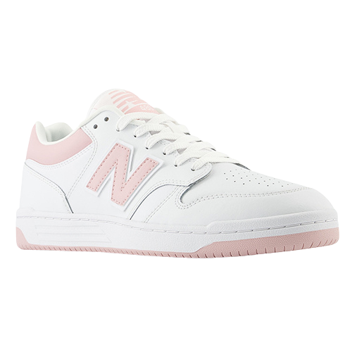 New Balance BB480LOP unisex laced leather trainers in white/pink.