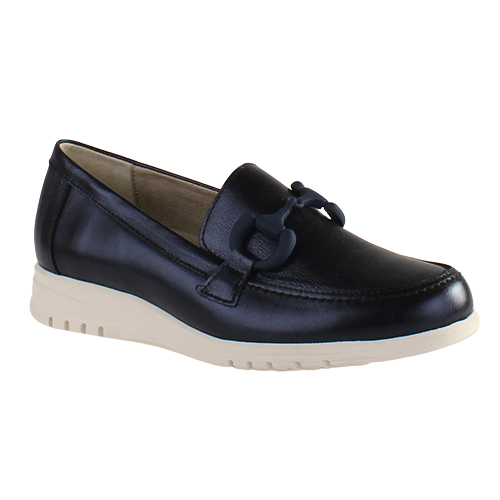 Feminine, moccasin style, slip on leather loafers, with metallic bar embellishment to front.