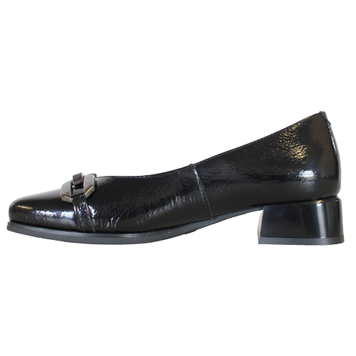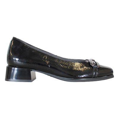 Classically elegant slip on patent leather pump, with flattering V shaped vamp and metallic embellishment to front.