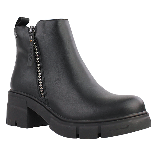 Funky and chunky, rounded toe ankle boots with outside zip detail.