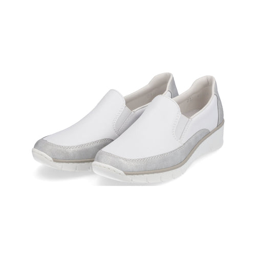 Everyday, slip on shoes with side elastic gussets, metallic silver trims and Rieker insignia to side.