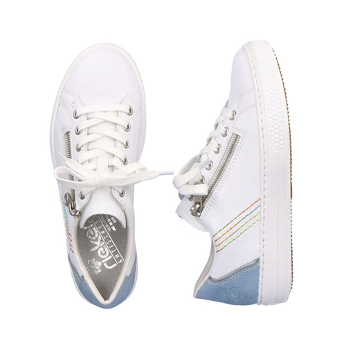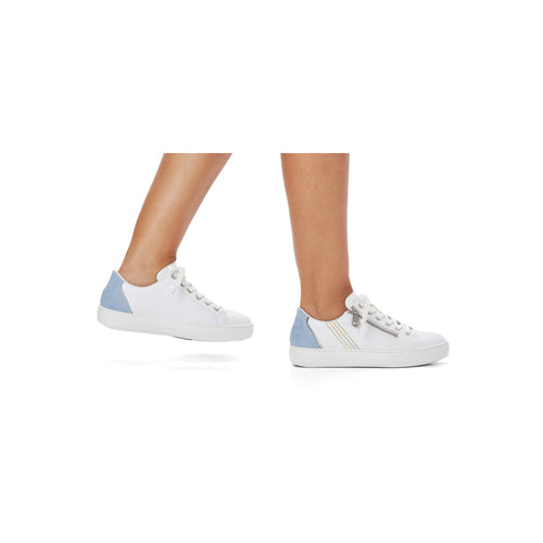 Rieker L5915-80 laced imi-leather trainers in white/blue.