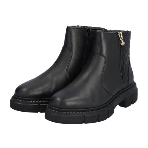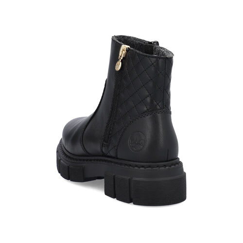 Trendy, chunky ankle boots with quilted back panel, outside zip with decorative toggle and Rieker insignia to side.