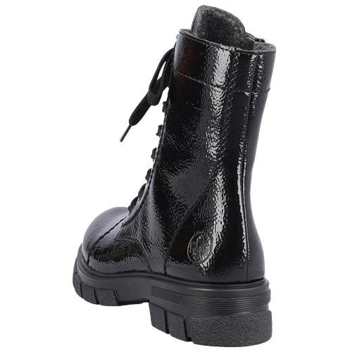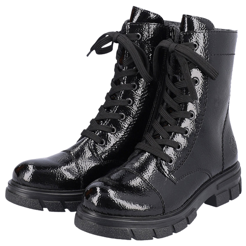 On trend, eight eyelet patent effect, military style ankle  boots with round toe and Rieker insignia to side.