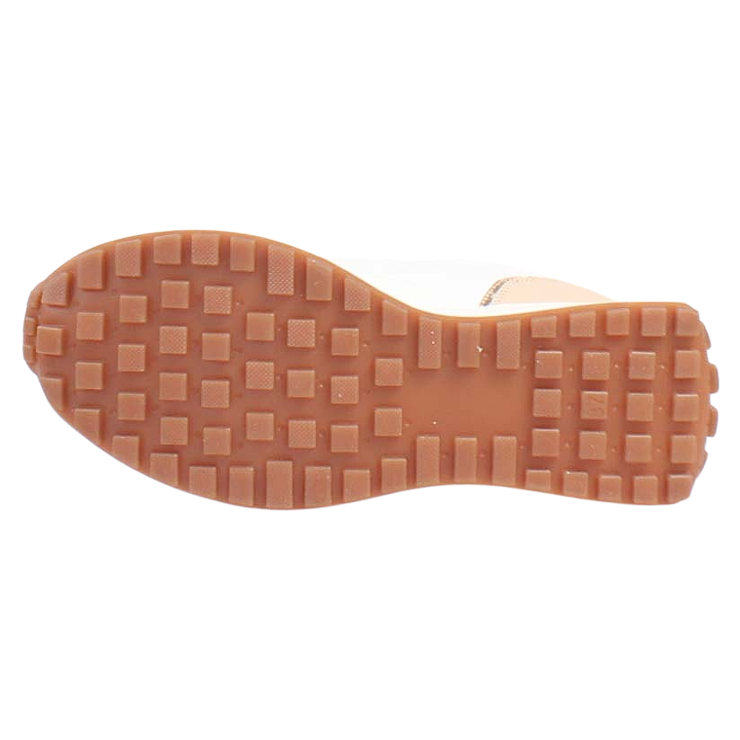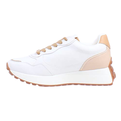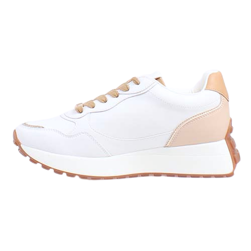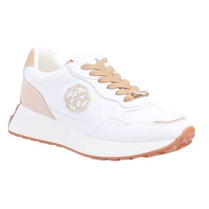 Sporty, six eyelet trainer with contrast laces, gold trims, contrast heel trim, metallic side embellishment and Bowe branding.