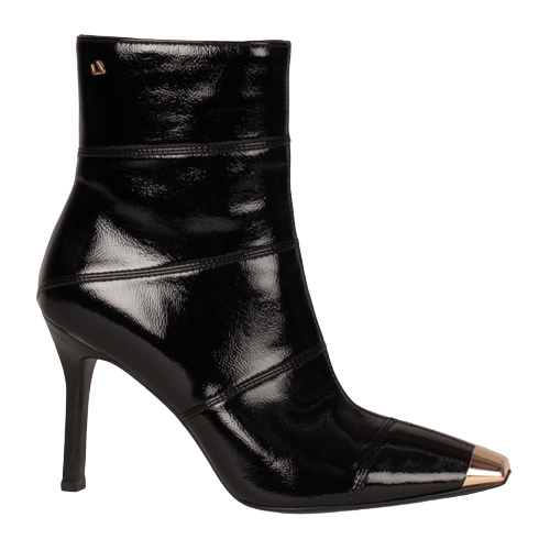 Smooth and shiny, square toed boot, with metallic toe trim and panel effect seam detail, coming right up around the ankle with signature U insignia to side.