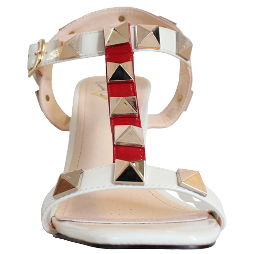 Towering and glamorous, patent effect ,on trend sandals, with stud embellished front strap and T-Bar adjoining  elegant ankle strap with buckle closure, with U branding to side.