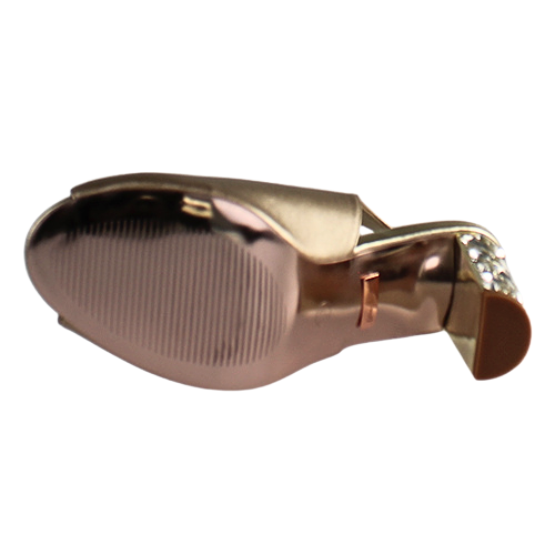 Elegant and glamorous, with flattering V shaped peep toe maximum coverage front, ankle strap with buckle closure , eye catching gem embellished heel with signature U branding.
