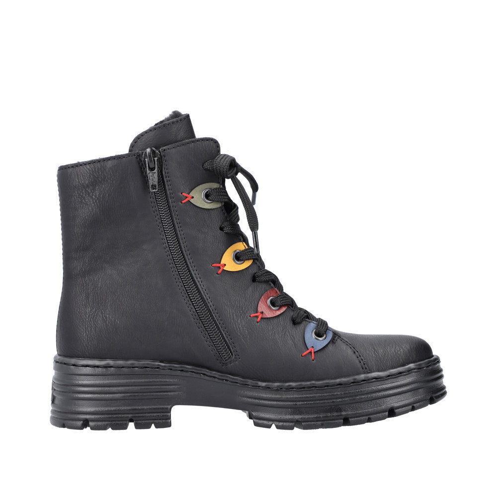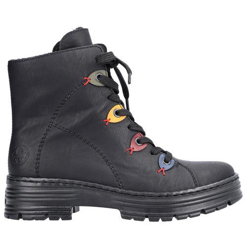 Trendy multi eyelet laced boots with eye catching colourful eyelets and Rieker insignia to side.