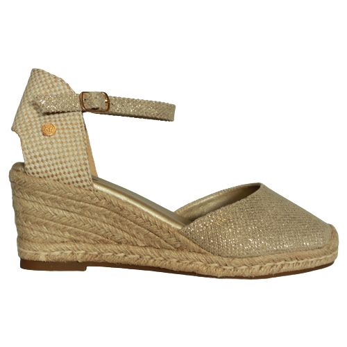 Espadrille style sandals, with shimmering closed front panel , partially closed hessian style back panel , narrow ankle strap with buckle detail and  XTI branding to side.