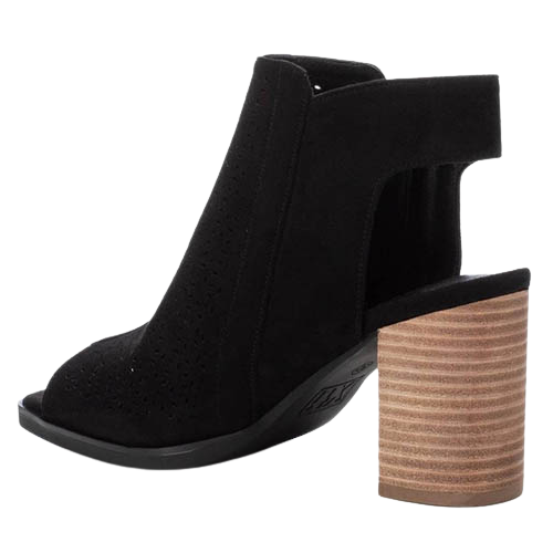 With an ankle boot vibe and peep toe front, laser cut wide strap coming right up around the ankle, side zip detail, open heel and ankle strap, with XTI branding.