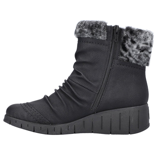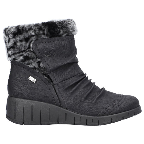 Coming high up on the ankle, low wedge boots with overstitched pattern and slouchy detail to front, eye catching ankle and side fur trim and Rieker branding to side.